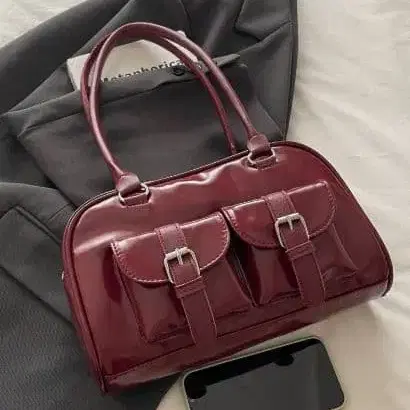 광택이 나는 버건디 색상의 보스턴 백, 프론트 포켓이 있어 실용적입니다. - 색상: 버건디 - 디자인: 2개의 프론트 포켓 부착 - 소재: 광택이 나는 합성 피혁 - 핸들 스타일: 더블 핸들 - 모양: 보스턴형 방문해 주셔서 감사합니다.