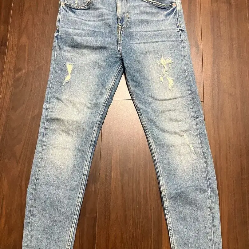 ZARA의 데미지 가공이 들어간 라이트 블루 스키니 데님입니다.