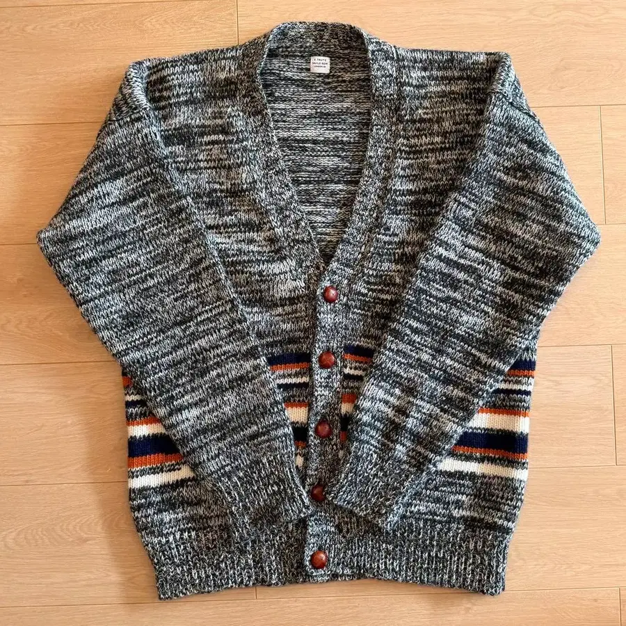 그레이 계열의 스트라이프 디자인 니트 가디건, 브라운 버튼 포함.