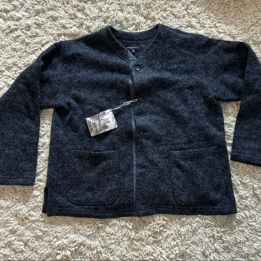 다크 블루 색상의 ENGINEERED GARMENTS 버튼 가디건, M 사이즈, 앞면 포켓 부착.