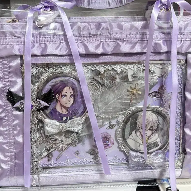 라벤더 색상의 캐릭터 아트 토트백, 투명 PVC와 새틴 소재, 리본과 프릴 디자인. - 색상: 라벤더 - 디자인: 캐릭터 아트 포함 - 소재: 투명 PVC와 새틴 - 사이즈: 빅 토트백 - 특징: 리본 포함, 프릴 디자인 - 안쪽: 투명 포켓 부착 그림 5 추가 시 +1500엔 캔뱃지 없음 방문해 주셔서 감사합니다.