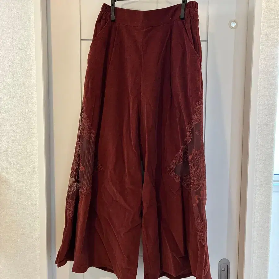 버건디 색상의 레이스 장식이 들어간 가우초 팬츠. - 색상: 버건디 - 디자인: 레이스 장식 - 스타일: 가우초 팬츠 - 허리: 허리밴딩 방문해 주셔서 감사합니다. 구매 당시 만족하여 그대로 봉투에 넣어두었기 때문에 새상품, 미착용이지만 주름이 눈에 띕니다. 신경 쓰이지 않으시면 구매 검토 부탁드립니다.