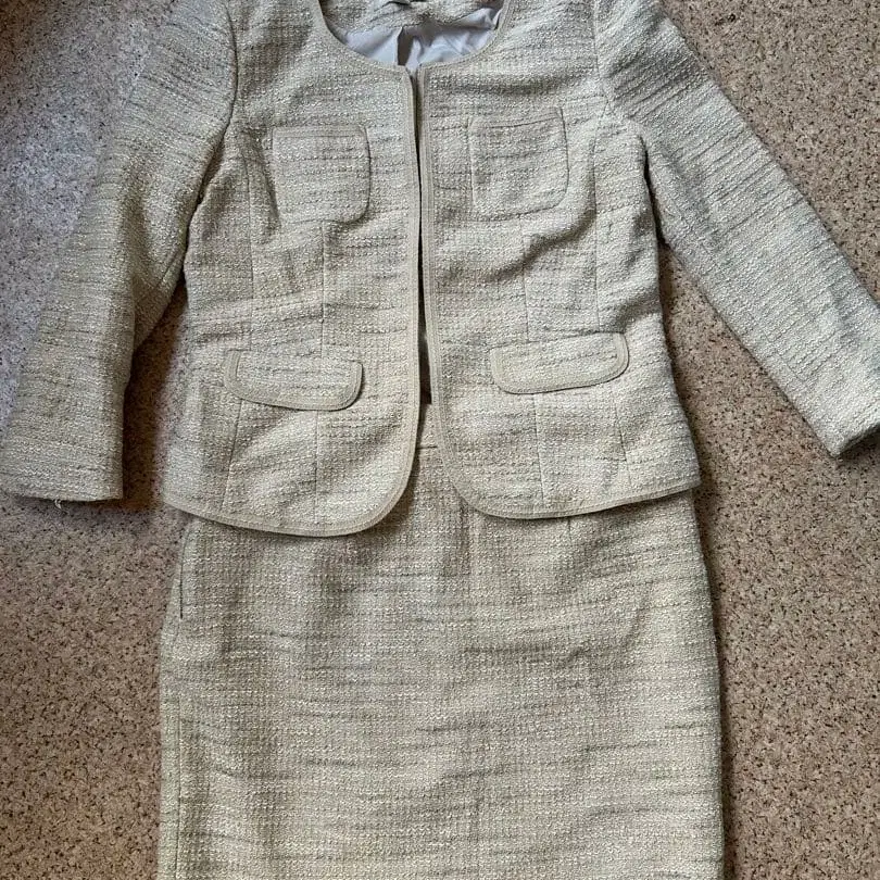아이보리 트위드풍 스커트 세트업. 슬리브가 달린 자켓과 스커트가 세트입니다. - 색상: 아이보리 - 디자인: 자켓과 스커트 세트업 - 소재: 트위드풍 원단 - 포켓: 앞면에 2개의 포켓 - 스타일: 슬리브가 달린 자켓 방문해 주셔서 감사합니다. 사이즈, 자켓: 4, 스커트: 6 사이즈 - M