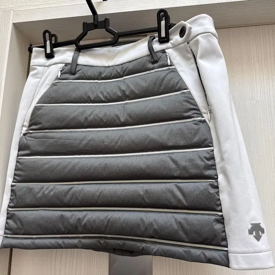 퀼팅 디자인의 그레이와 화이트 스커트, 하단에 화살표 로고 포함. - 색상: 그레이와 화이트 콤비네이션 - 디자인: 퀼팅 스타일 - 로고: 하단에 화살표 로고 - 스타일: 스커트 방문해 주셔서 감사합니다.