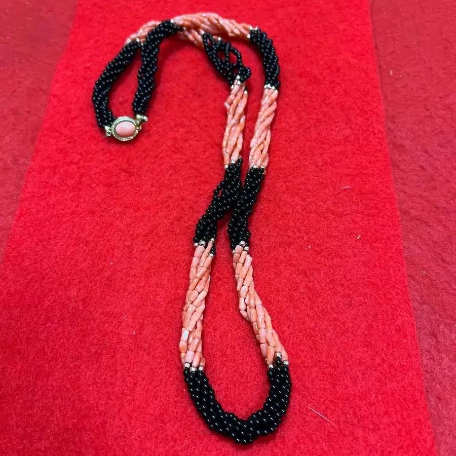 블랙과 핑크 비즈를 사용한 트위스트 편직 목걸이. - 색상: 블랙 오닉스와 핑크 비즈 - 소재: 비즈 (콜라) - 클로징: 골드 컬러 클로징 - 디자인: 트위스트 편직 디자인 - 특징: 장식적인 디자인과 색상의 대비 방문해 주셔서 감사합니다.