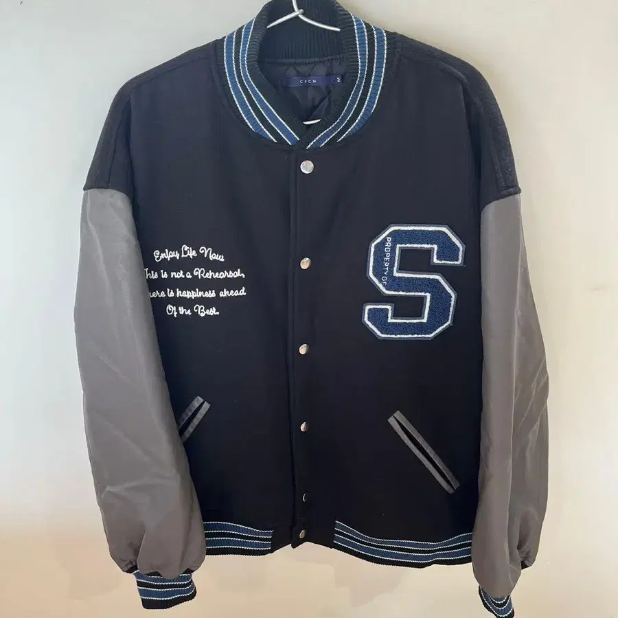 CPCM 바시티 자켓 블랙 그레이 소매 와펜 자수