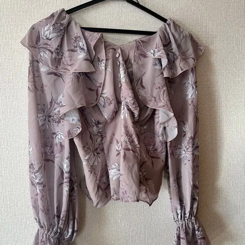 1회 착용했습니다. 블라우스와 스커트 세트입니다. - 색상: 연보라색 꽃무늬 - 디자인: 프릴이 달린 긴팔 블라우스 - 디자인: 앞면의 리본 조정 가능 - 디자인: 드레이프 가공 스커트