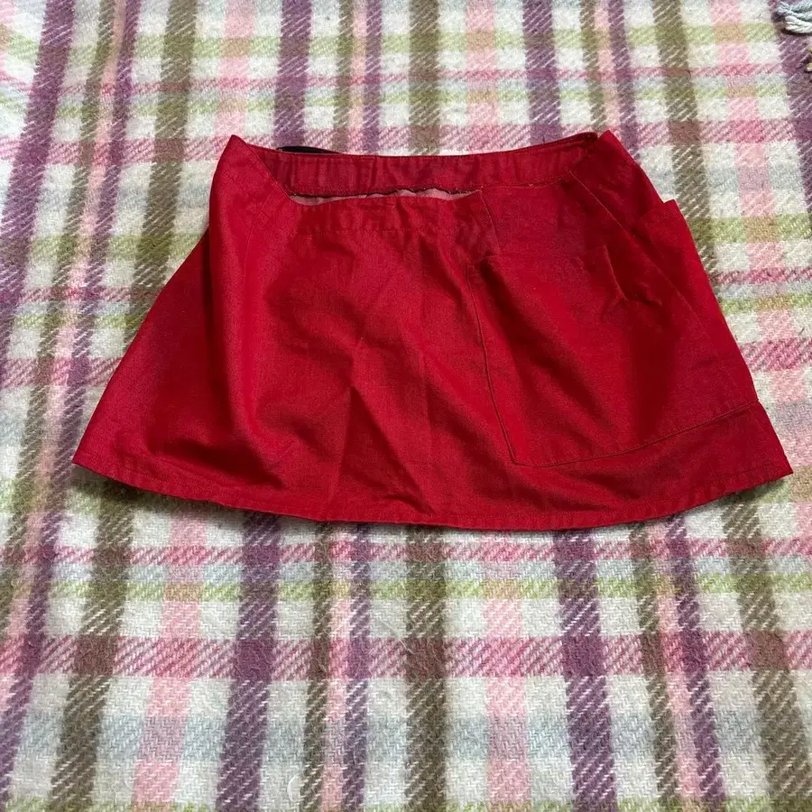 사이즈 - FREE SIZE 꼼사데모드의 빨간색 랩 에이프런입니다. 길이는 매우 짧습니다. 선물로 받아 몇 번 의류에 맞춰 착용했지만, 사용하지는 않았습니다. 포켓 근처에 하얀 얼룩 같은 것이 있으며, 색이 바랜 듯한 느낌입니다.