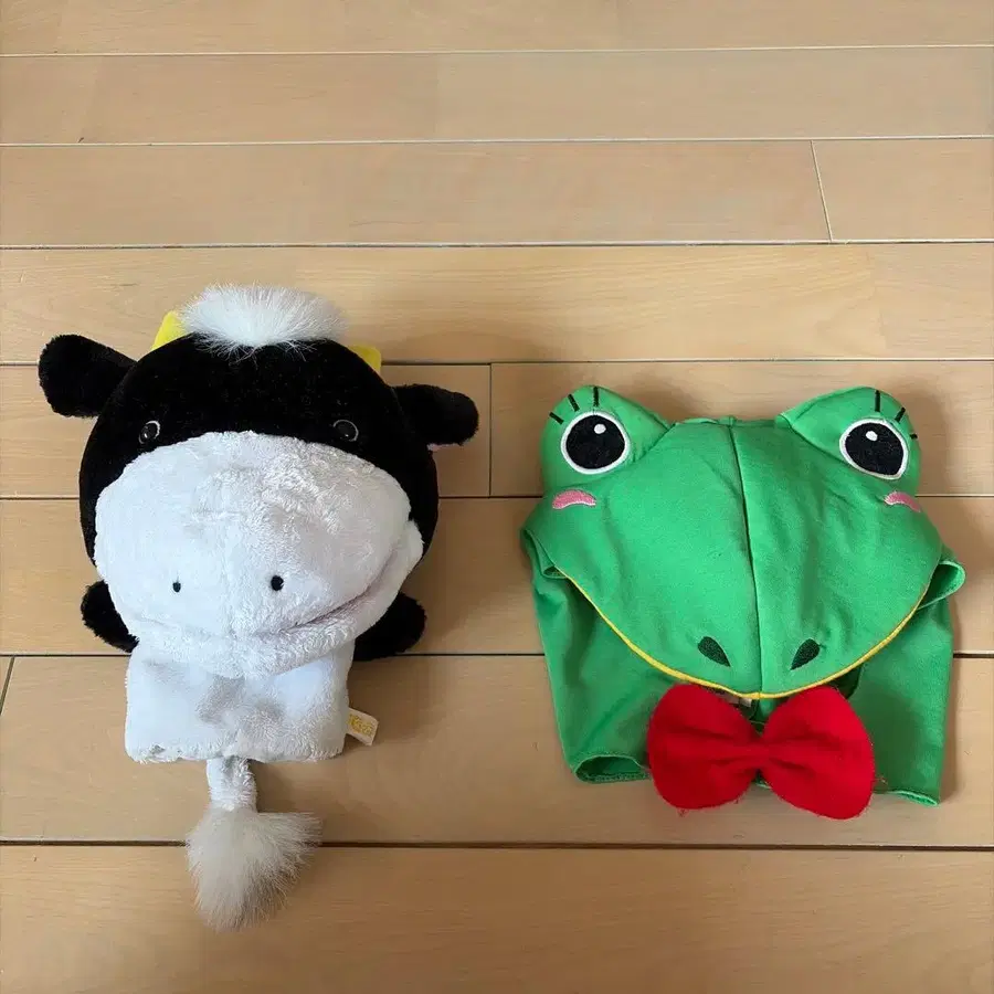 소와 개구리 디자인의 봉제 인형 세트로, 귀여운 표정이 특징입니다. - 디자인: 소 퍼펫 - 디자인: 개구리 모자 방문해 주셔서 감사합니다.