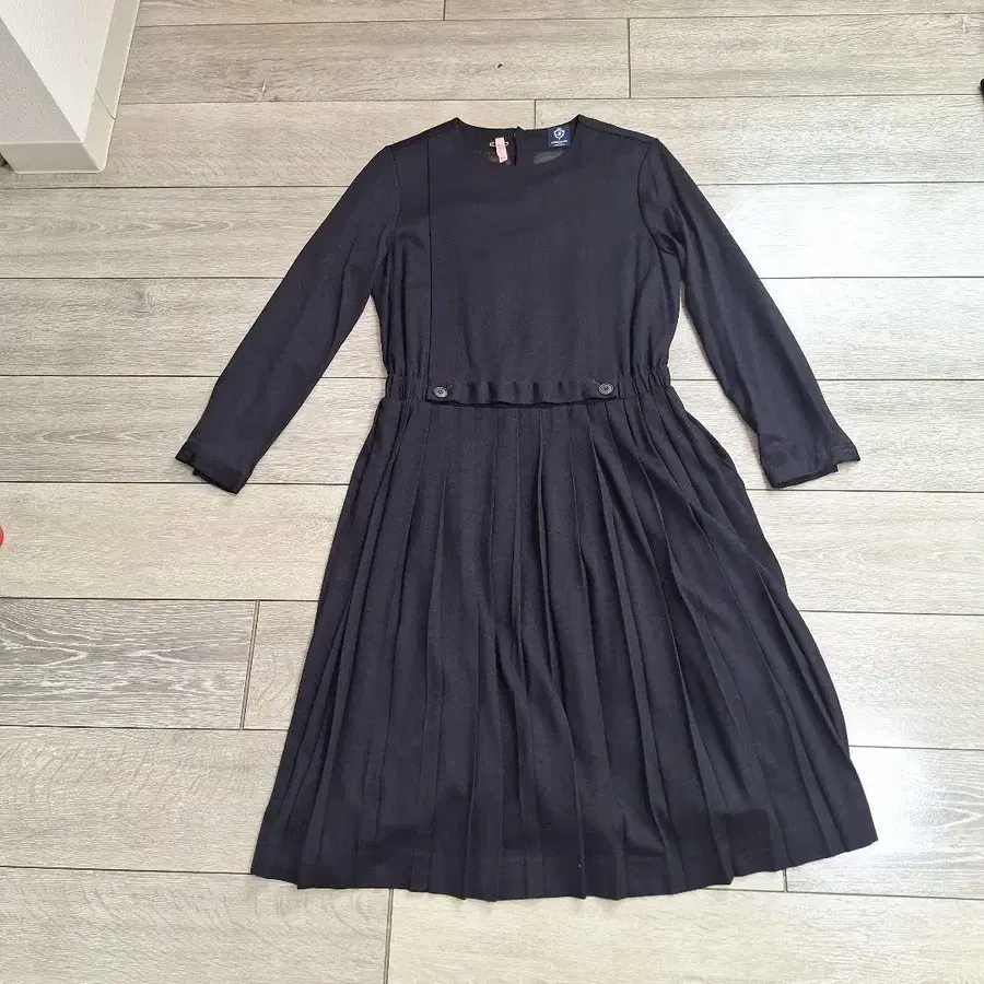 자동 번역되었어요. 원문보기다크 네이비 긴팔 플리츠 원피스, 버튼 디자인.
