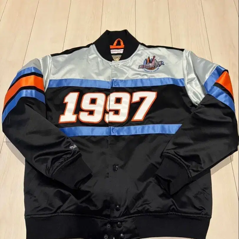 1997년 NBA 올스타 위크엔드를 기념하는 바시티 자켓, Mitchell & Ness 제조 하드 우드 클래식. 어깨 너비 53 가슴 너비 61 기장 69 2회 착용만 한 새상품급입니다. - 브랜드: Mitchell & Ness - 사이즈: L - 디자인: All-Star Weekend Cleveland 97 - 색상: 블랙/실버/오렌지/블루