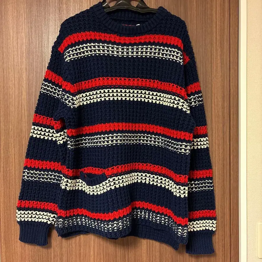 네이비와 빨간색 스트라이프 디자인의 니트 스웨터. 사용 횟수 2회 - 색상: 네이비/빨간색/화이트 스트라이프 - 브랜드: BLUE/BLUE - 사이즈: 2 방문해 주셔서 감사합니다. 얼룩, 찢김, 냄새 등 - 없음