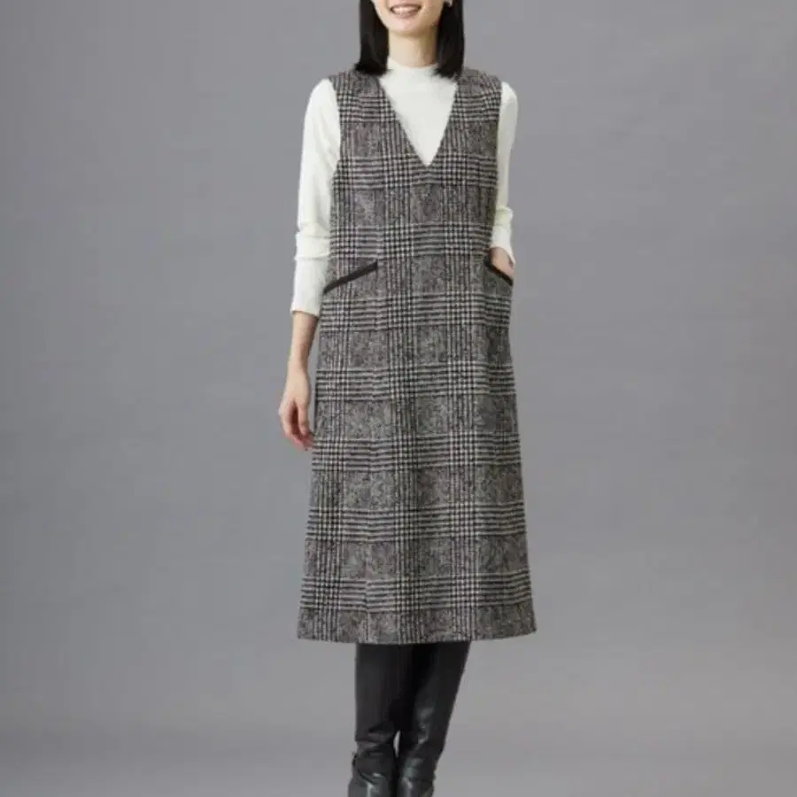 계절감이 느껴지는 글렌체크 패턴의 깊은 V넥 오버롤 스커트. 색상은 브라운이지만 블랙과 크게 다르지 않으면서도 부드러운 인상을 줍니다. 단 한 번 짧은 시간 착용했습니다. ■ 디자인 심플하면서도 포켓 디테일에 별도 천을 사용하여 악센트를 준 오버롤 스커트입니다. 깊은 V넥이 성숙한 인상을 주며, 함께 입는 이너에 따라 느낌이 달라져서 격식 있는 자리와 평상시 모두 활용 가능합니다. 뒷면에 센터 슬릿을 넣어 활동성을 높인 것도 좋은 포인트입니다. 뒷면 중앙에 지퍼를 달아 입고 벗기 편리합니다. 암홀을 내려서 이너가 거슬리지 않고 편안하게 착용할 수 있습니다. 추운 시기에는 아우터 안에 입어도 멋스러운 다용도 아이템입니다. 전체 안감이 있습니다. ■ 소재 경사에는 실크 100%의 축사(심지사)와 방모 울을 연사한 실을 사용하고, 위사에는 트라이 스핀 방적 루프사를 사용한 트위드 소재입니다. 실크를 사용하여 경량감과 광택을 더했습니다. 트라이 스핀사는 실의 굵기가 랜덤으로 되어 있어 글렌체크에 은은한 입체감을 더해줍니다. 사이즈는 S이지만 평소 M 사이즈를 입는 저에게도 잘 맞았습니다. 가슴 너비 44cm 기장 109cm 오차는 양해 부탁드립니다. u00a535,970 패턴 - 체크 계절 - 가을/겨울 얼룩, 찢김, 냄새 등 - 없음
