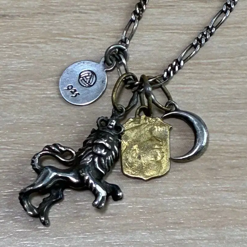 사자 모티브의 실버 목걸이, 섬세한 조각과 금 도금 참 포함. - 소재: 실버 및 금 도금 참 - 디자인: 사자 모티브 - 체인 타입: 트위스트 체인 - 참 개수: 참 3개 - 길이: 표준 목걸이 길이 - 디테일: 사자의 섬세한 조각 - 기타 참: 십자가와 엠블럼 10년 이상 전에 구매한 것으로, 전체적으로 녹이 있습니다. 중고품에 이해가 있는 분께서 구매해 주시기 바랍니다. 방문해 주셔서 감사합니다.