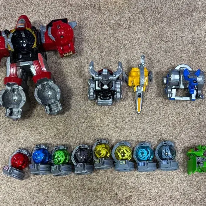 다채로운 색상의 슈퍼전대 히어로 로봇 완구, 미니 로봇과 코어 부품 포함.
