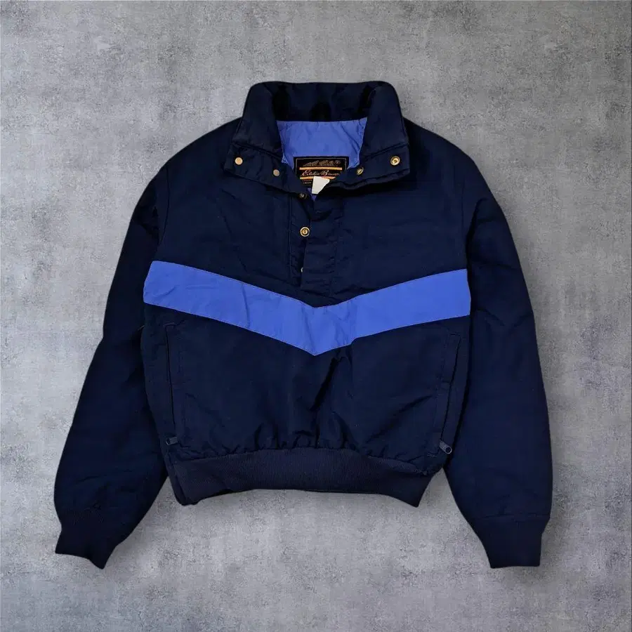 네이비 색상에 스카이블루 라인이 들어간 레트로한 디자인이며 밑단과 소매는 리브로 되어 있어 지퍼를 잠그면 뛰어난 보온성을 자랑합니다.