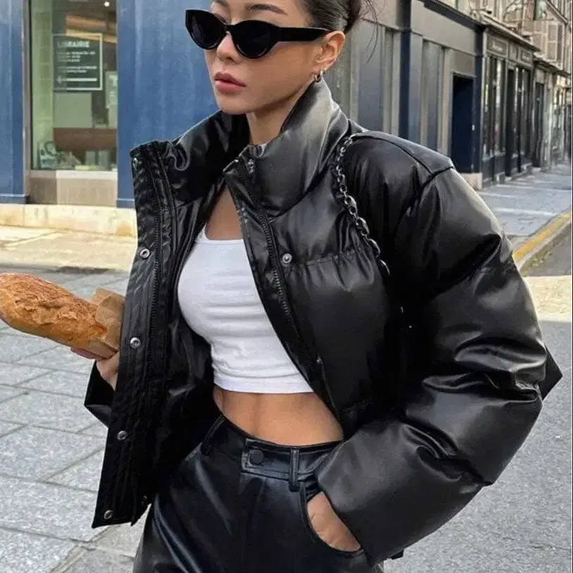 광택이 나는 블랙 색상의 숏 다운 자켓으로, 스냅 버튼과 사이드 포켓이 있습니다.