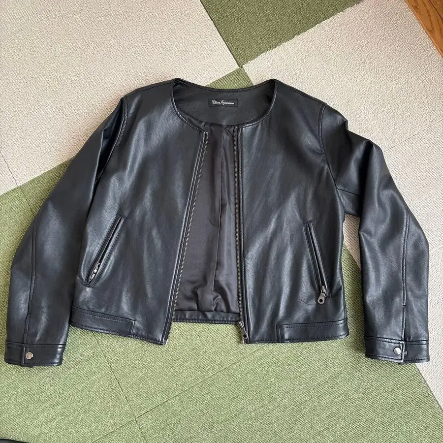 숏 기장의 블랙 가죽 자켓, 지퍼가 달려 있어 스타일리시합니다.