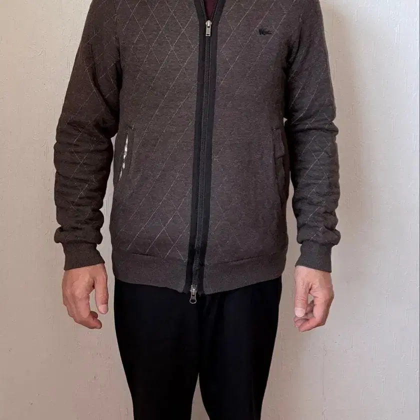 다이아몬드 패턴의 다크 그레이 풀 집업 자켓, 캐주얼 스타일에 최적.