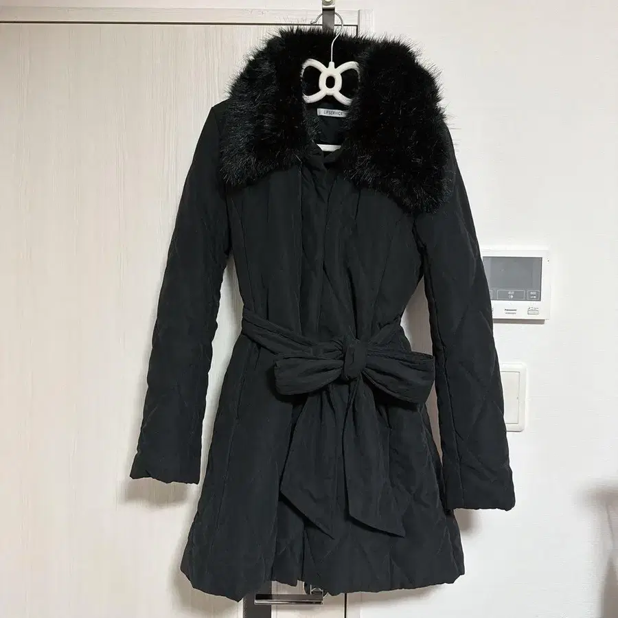 퍼가 달린 후드와 허리 리본이 특징인 블랙 다운 자켓. 라이너 탈부착 가능 - 색상: 블랙 - 디자인: 퍼 포함 후드 - 스타일: 허리 리본 포함 - 특징: 퀼팅 디자인 방문해 주셔서 감사합니다.