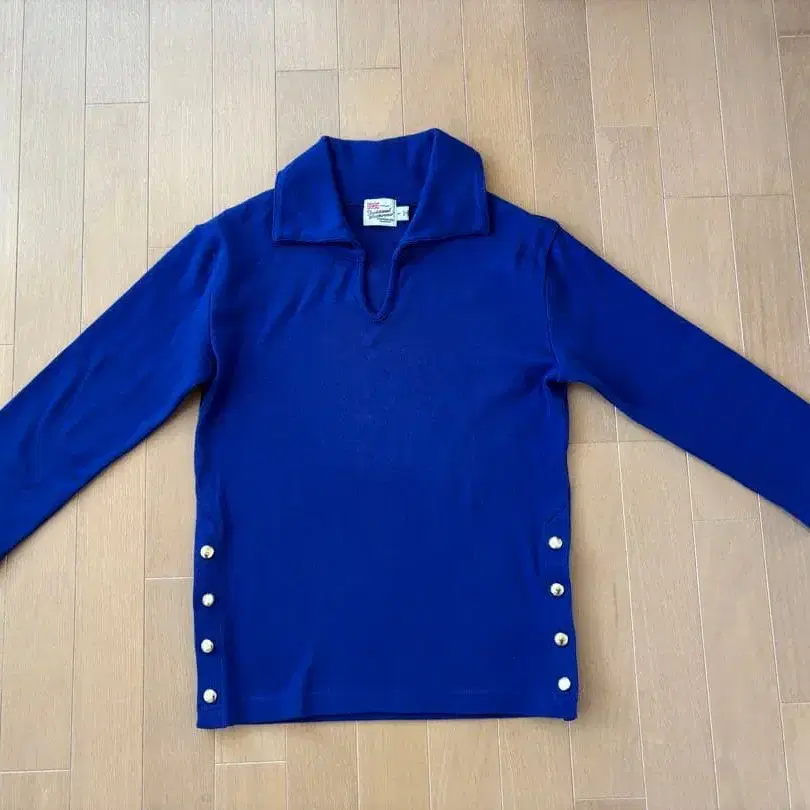 네이비 색상의 긴팔 피케 셔츠, 버튼이 달린 사이드 디자인.