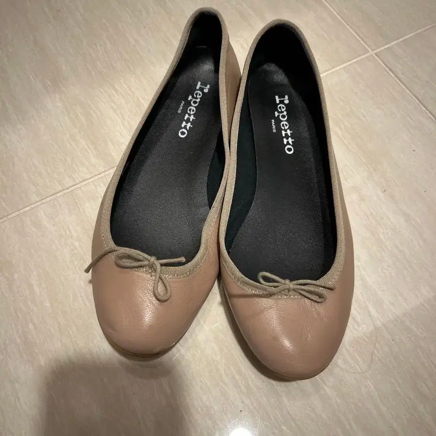 베이지 색상의 가죽 발레 슈즈, 리본이 포함된 엘레강트한 디자인. - 브랜드: Repetto - 색상: 베이지 - 스타일: 발레 슈즈 - 디자인: 리본 포함 - 소재: 가죽 방문해 주셔서 감사합니다. 사이즈 - 24cm 38 1/2