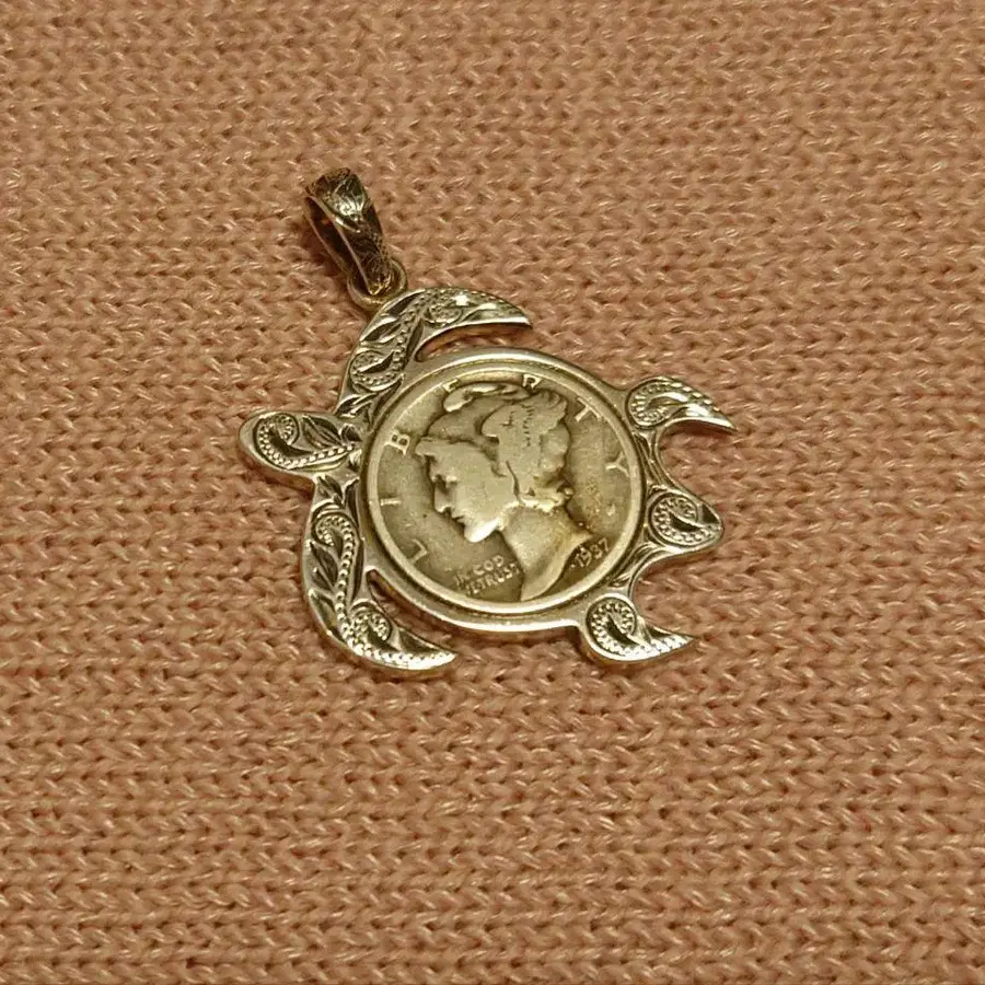 호누 모양의 실버 펜던트 탑입니다. 중앙에는 머큐리 다임이라고 불리는 미국 코인이 들어 있습니다. 호누 부분에는 손 조각도 들어가 있습니다. - 디자인: 바다거북 (호누) - 소재: 실버 925 - 무게: 약 11.1그램 방문해 주셔서 감사합니다.