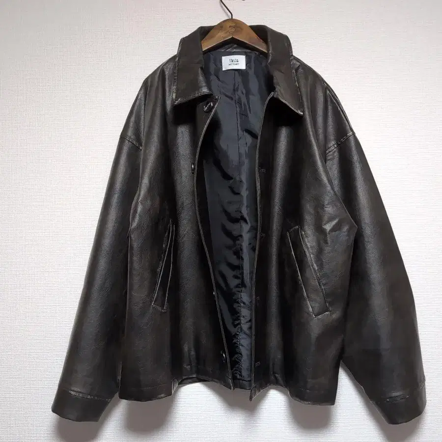 블랙의 빈티지풍 인조 가죽 자켓, 단추식 디자인으로 사이드 포켓이 있습니다.