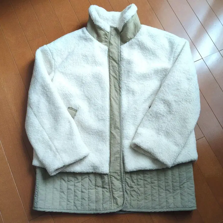 이곳에서 한번 착용한 새상품급으로 양도받았으나, 저에게는 사이즈가 맞지 않아 자택 보관하고 있었습니다. 소매에 약간 필링이 있습니다. 폴리에스테르 100%의 화이트와 베이지 퀼팅 자켓, 9호 사이즈. - 색상: 화이트/베이지 - 소재: 폴리에스테르 100% - 사이즈: M~L 상당 - 디자인: 퀼팅 자켓 - 스타일: 후드 없음 방문해 주셔서 감사합니다.