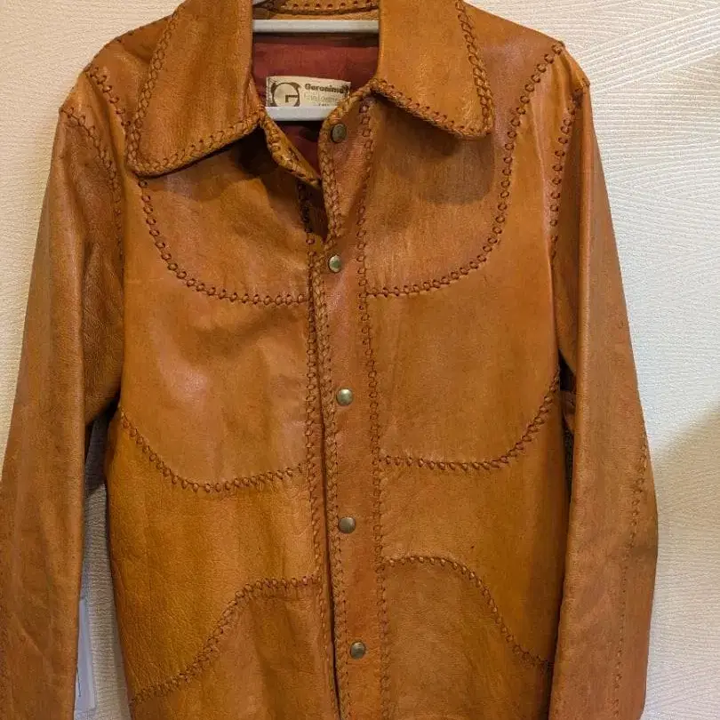 방문해 주셔서 감사합니다. Geronimo Fine Leathers (제르니모 파인 레더스)의 빈티지 가죽 자켓입니다. ■ 개요 - 브랜드: Geronimo - 소재: 가죽 - 디자인: 휘핑 스티치 - 색상: 브라운 계열 - 사이즈: 42 - 사이즈 (실측치수): 어깨 너비: 48cm 가슴 너비: 54cm 기장: 71cm 소매 길이: 65cm ※ 개인 측정으로 인한 약간의 오차는 양해 부탁드립니다. [ 상품 설명 ] ■ 특징 • Geronimo는 주로 1970년대~1980년대에 큰 인기를 누렸던 빈티지 가죽 스웨이드 의류 브랜드입니다. 특히 1970년대의 [히피 무브먼트]와 [웨스턴 스타일]의 유행과 함께 미국과 일본으로 많이 수출되었습니다. • 테두리에 가죽 끈을 엮은 [휘핑 스티치 (가죽 끈 엮기)]가 가장 큰 특징입니다. 이는 당시 멕시코제 가죽 의류에서 흔히 볼 수 있는 전통적인 기법입니다. • 프론트, 백, 옷깃, 소매에 이르기까지 숙련된 장인의 솜씨를 느낄 수 있는 가죽 스티치가 고급스럽게 장식되어 있습니다. • 프론트는 스냅 버튼 사양으로 입고 벗기가 편리합니다. • 1970년대 모델에는 선명한 빨간색이나 새틴 안감이 사용되는 경우가 많으며, 빈티지로서 구별하는 포인트가 됩니다. ■ 사이즈 • 표기 사이즈: 42 ■ 상태 빈티지 제품으로 전체적으로 사용감이 있습니다. • 가죽 특유의 마찰과 소매, 뒷면 등에 몇 군데 블랙헤드나 얼룩이 보입니다. • 안감 택 근처에 일부 실이 튀어나온 부분이 있습니다. 큰 데미지는 없지만, 빈티지 가죽 특유의 질감과 에이징으로 즐겨주실 분, 구제 의류에 대한 이해가 있는 분만 구매 부탁드립니다. 색상 - 브라운 계열