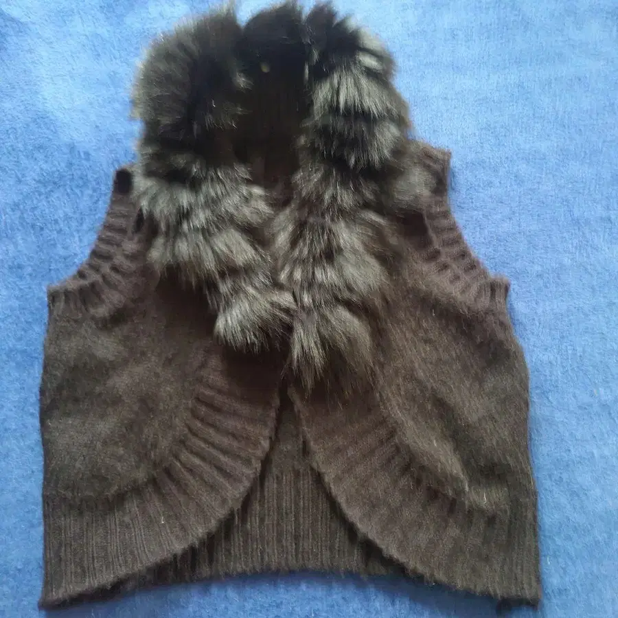 퍼가 달린 블랙 니트 베스트. - 색상: 블랙 - 소재: 니트 - 특징: 퍼(폭스) 옷깃 - 디자인: 케이블 짜임 - 퍼는 탈부착 가능 - 길이는 47cm 정도의 숏 베스트 - 실이 얇아진 부분이 있습니다. - 방문해 주셔서 감사합니다.