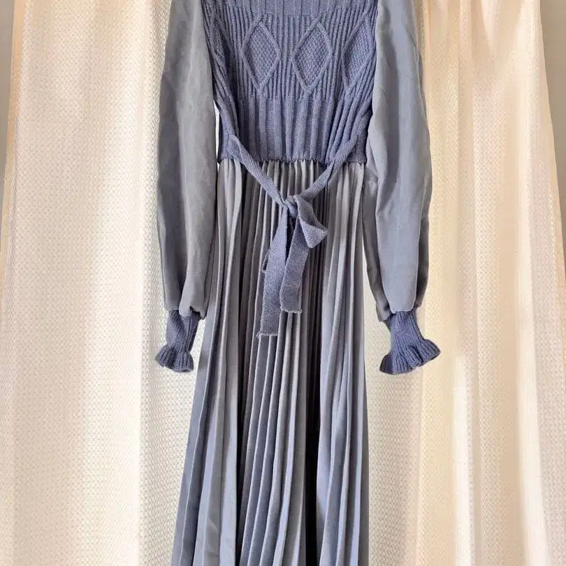 기장 102cm 소매 64cm 어깨 너비 37cm 디자인: 니트와 플리츠의 콤비네이션 소매 스타일: 긴팔 프릴 소매 방문해 주셔서 감사합니다. 색상 - 블루 계열 계절 - 가을/겨울
