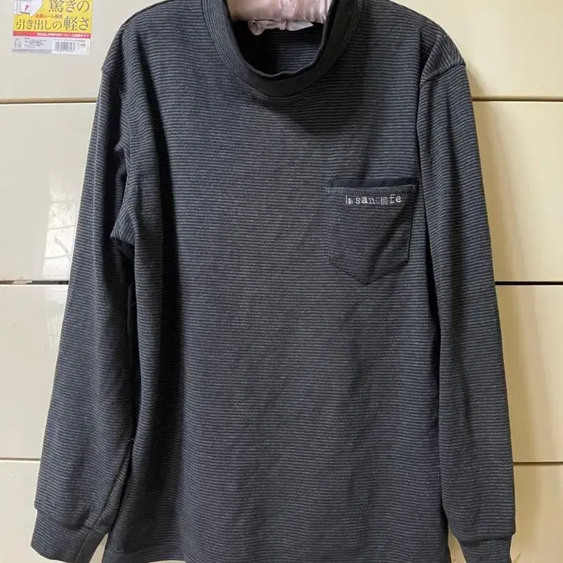 산타페의 다크 그레이 스트라이프 패턴 하이넥 티셔츠, 가슴 포켓이 부착되어 스타일리시합니다.