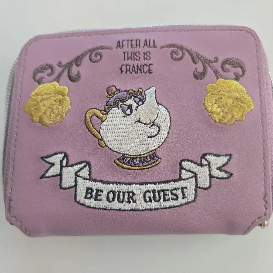 자수 디자인의 핑크 3단 폴더형 지갑 - 색상: 핑크 - 디자인: 자수 디자인 (찻주전자와 캐릭터) - 텍스트: AFTER ALL THIS IS FRANCE, BE OUR GUEST - 캐릭터: 칩 (찻주전자의 캐릭터) 방문해 주셔서 감사합니다.
