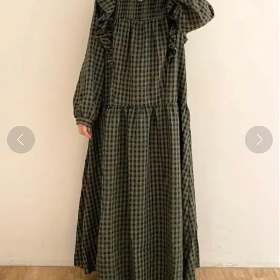 그린 계열 체크 무늬의 프릴 달린 긴팔 롱 원피스, 코튼 혼방 소재로 쾌적한 착용감.