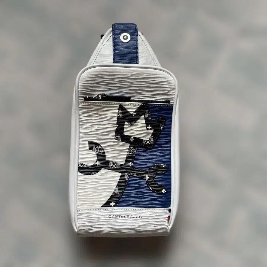 합성 피혁 소재의 화이트와 블루 색상 바디백으로, 조정 가능한 스트랩과 메쉬 포켓이 있어 기능적입니다. 조금 더 큰 가방으로 바꾸게 되어 사용하실 분께 양도하고 싶습니다.