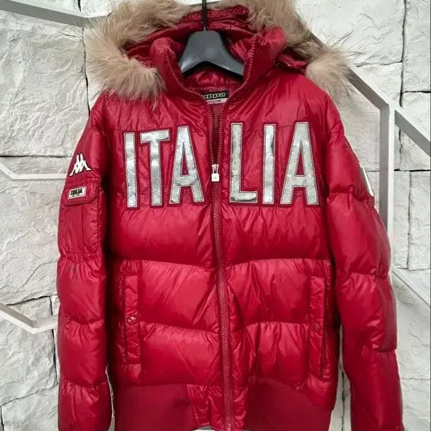 퍼가 달린 후드와 ITALIA 로고가 특징인 빨간색 다운 자켓.
