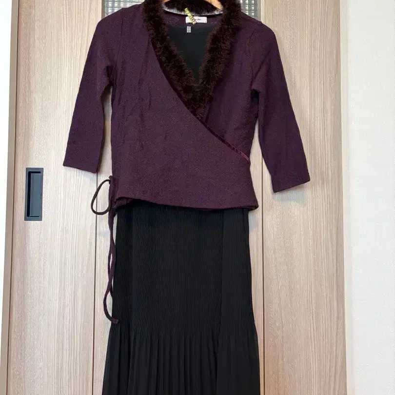 퍼 달린 옷깃 카슈쿨 가디건과 플리츠 스커트 원피스 세트