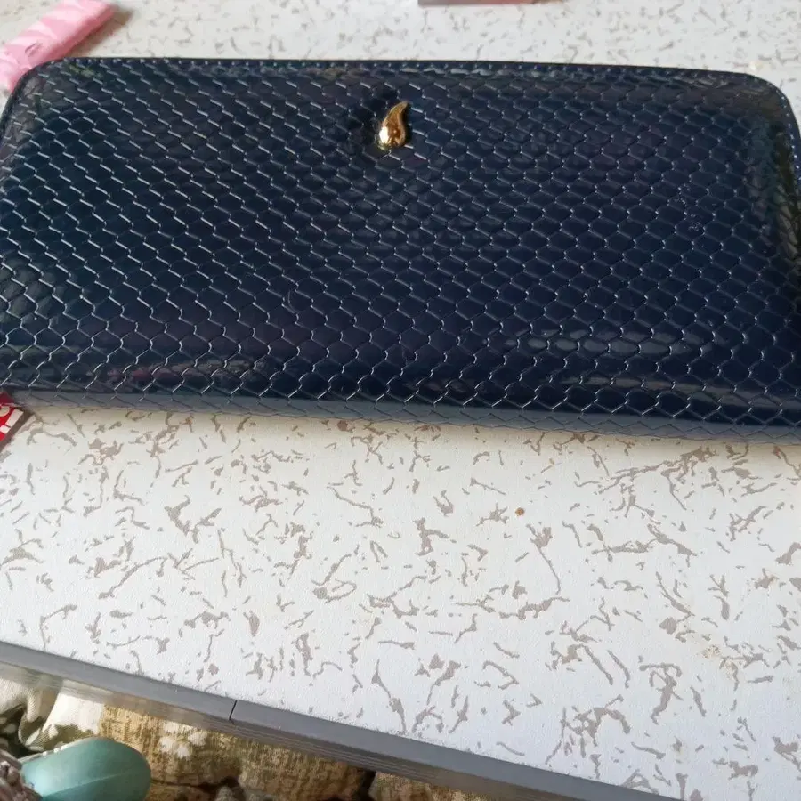 네이비 색상의 가죽 메쉬 디자인 지갑.