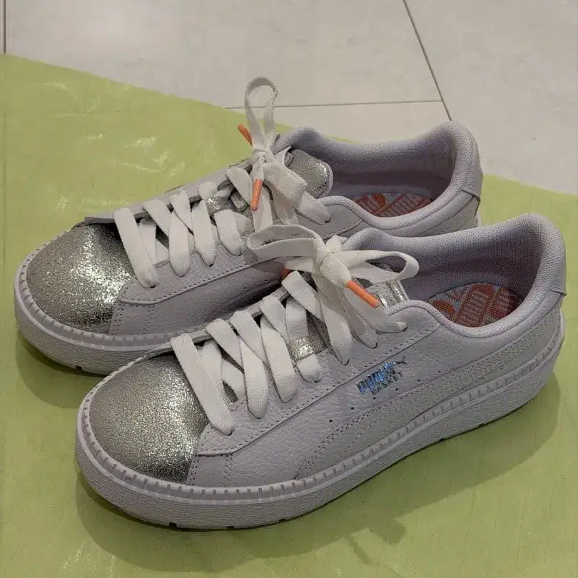 글리터가 달린 화이트 스니커즈입니다. 브랜드: PUMA 사이즈 - 24cm 플랫폼 레이스 바이오 킹 새상품으로 구매 후 몇 번 신었습니다. 눈에 띄는 흠집이나 얼룩은 없지만, 사용에 따른 약간의 흠집이나 얼룩이 있을 수 있으니 이해하시는 분만 구매 부탁드립니다.
