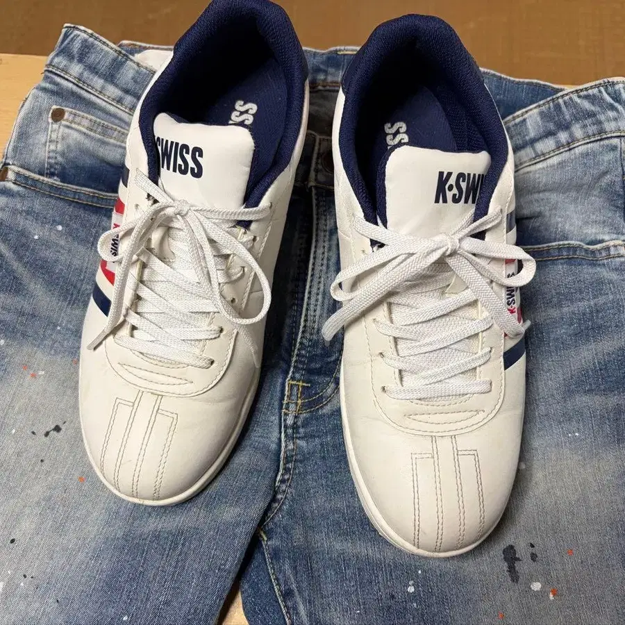 화이트와 네이비 스트라이프 디자인의 K-SWISS 스니커즈. 약간의 사용감이 있지만 아직 충분히 사용 가능합니다. - 브랜드: K-SWISS - 색상: 화이트/네이비 - 스타일: 스니커즈 - 디자인: 스트라이프 디자인 - 소재: 합성 피혁 방문해 주셔서 감사합니다.