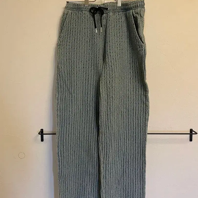 리브 디자인의 그레이 이지 팬츠, S 사이즈, 드로우 스트링으로 쾌적한 핏감.