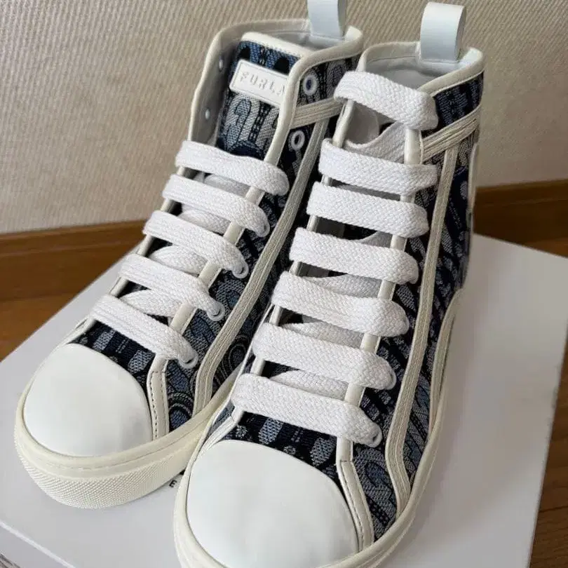 네이비와 화이트 색상의 하이컷 스니커즈, FURLA 로고 플레이트 포함. - 브랜드: FURLA - 색상: 네이비/화이트 - 스타일: 하이컷 스니커즈 - 소재: 캔버스/합성 피혁 - 특징: 로고 플레이트 포함 방문해 주셔서 감사합니다.