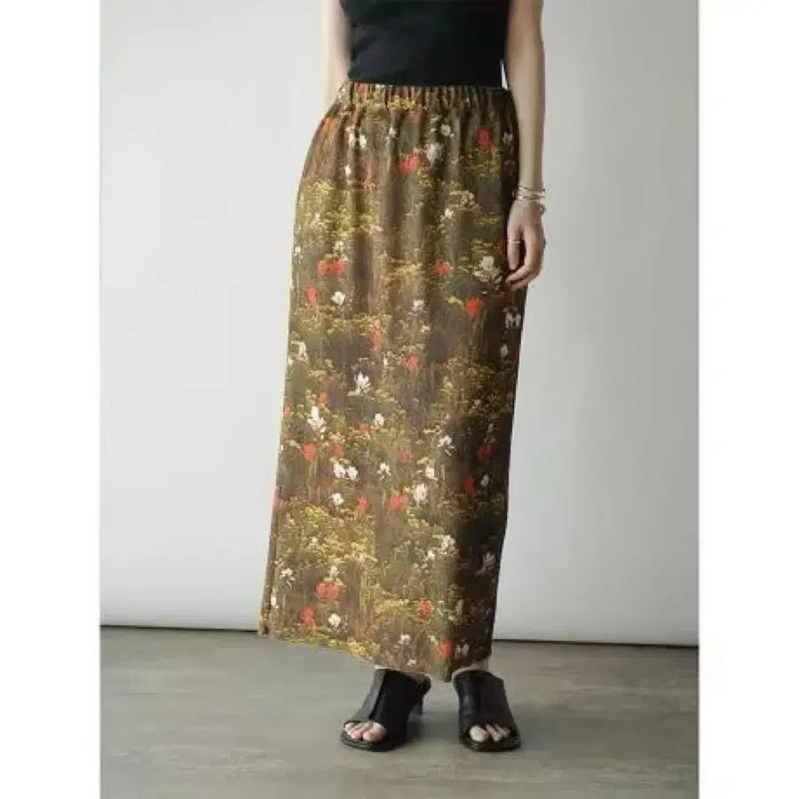 직접적으로 들어간 플라워 프린트가 눈길을 끄는 리브 타이트 스커트.