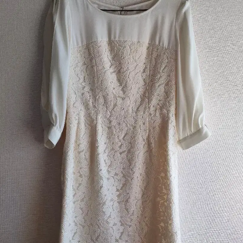 아이보리 색상의 레이스와 쉬폰 소재의 무릎 기장 원피스입니다. 7부 소매 디자인으로 엘레강트한 인상을 줍니다. 파티용으로 구매했으나 1회만 착용했습니다. 상태가 매우 좋다고 생각합니다. s 사이즈로 등록했지만, 택에는 36이라고 표시되어 있습니다. 전체 길이는 80cm입니다. - 색상: 아이보리 - 소재: 레이스와 쉬폰 - 소매 스타일: 7부 소매 - 디자인: 레이스 디테일 - 기장: 무릎 기장 방문해 주셔서 감사합니다.