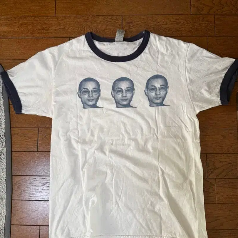 얼굴 프린트가 특징인 화이트 T셔츠. - 디자인: 얼굴 프린트가 3개 있는 디자인 - 색상: 화이트 - 소매 색상: 네이비 - 데미지: 작은 구멍 있음 방문해 주셔서 감사합니다.