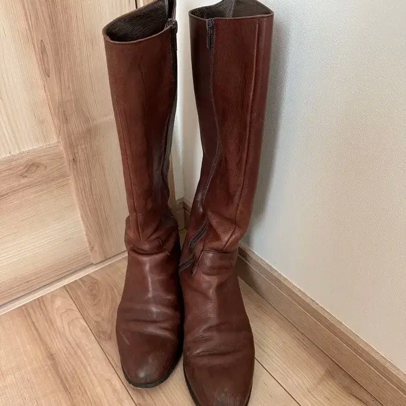 다크 브라운 색상의 가죽 롱 부츠, 지퍼와 중간 굽 디자인.