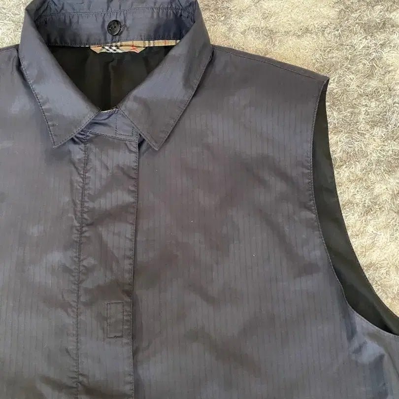스트라이프 패턴의 다크 그레이 슬리브리스 베스트, 앞면에 포켓 부착. 밑단에 드로 코드 있음. 옷깃은 탈부착 가능. 약간의 얼룩 있음(사진 7, 8장 참조) 일본제 나일론 100 사이즈 - M 기장 62, 어깨 너비 36, 가슴 너비 51