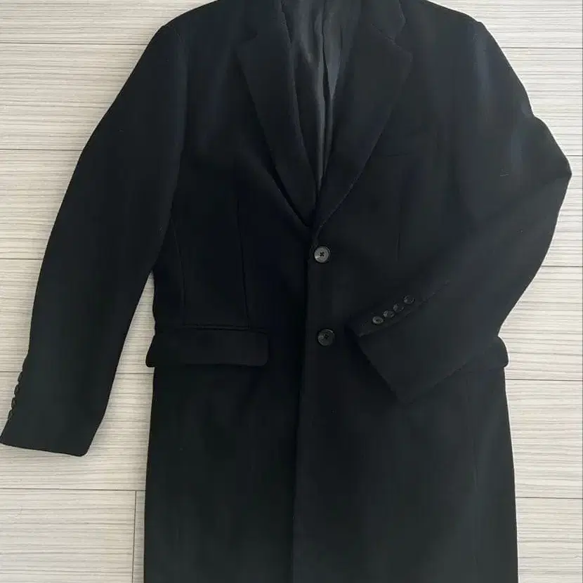 부드러운 안감의 블랙 체스터 코트, 2개 버튼 디자인.