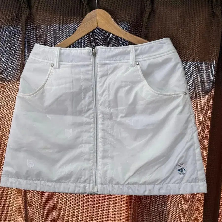 지퍼가 달린 리버서블 스커트입니다. 앞면과 뒷면에 포켓이 있으며, 실버 안감이 특징입니다.